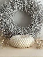 Die runde Kranzform ist vollständig aus kleinen, aneinandergereihten Perlen aufgebaut, was der Kerze eine besonders weiche, organische Struktur verleiht. Die cremeweiße Farbe des Rapswachses verstärkt den eleganten Charakter und lässt den Perlenkranz wie ein modernes Kunstobjekt wirken. Ideal als dezentes Winter-Deko-Element oder als festliche Ergänzung deiner Weihnachtsdekoration.
